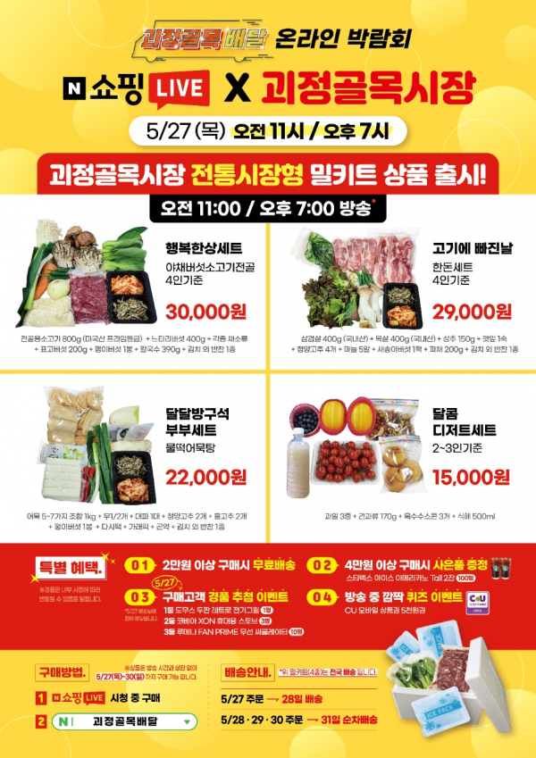 이번 생방송을 위해 구성된 맞춤형 밀키트 상품은 방송 시간과 관계없이 27일부터 30일까지, 네이버 스마트스토어 ‘괴정골목배달’에서 구매할 수 있다.