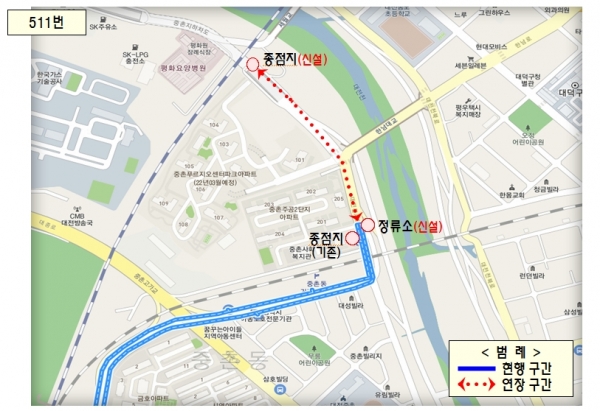 511번 종점은 현행 중촌주공2단지에서 평화요양병원 방면으로 약 400m 떨어진 중촌지하차도 상부로 옮겨져 평화요양병원 부근 주민뿐만 아니라, 향후 푸르지오센터파크 입주민들에게 시내버스 이용편의가 확대될 것으로 기대된다.