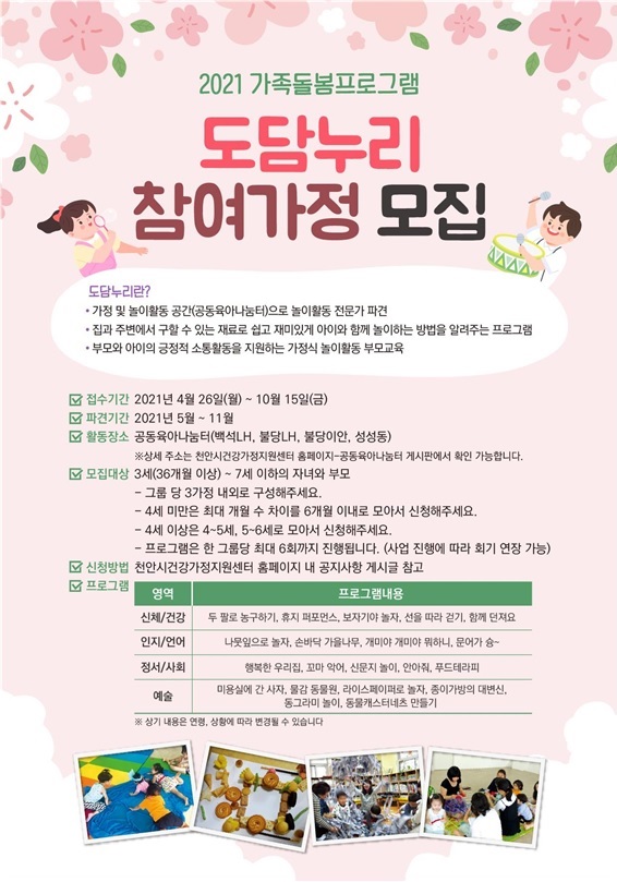 [충청뉴스큐] 천안시건강가정지원센터는 2021년 가족돌봄프로그램 ‘도담누리’ 놀이활동에 참여할 가정을 모집한다고 밝혔다.