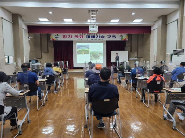 이번 교육은 딸기 재배기간 중 가장 중요한 육묘기를 맞아 고품질 우량묘 재배를 통해 딸기 생산성 향상 및 농가소득 증대에 도움을 주고자 추진됐으며 코로나19 예방을 위해 발열체크, 마스크 착용 및 좌석 간 띄어앉기 등 방역수칙을 준수한 가운데 진행됐다.