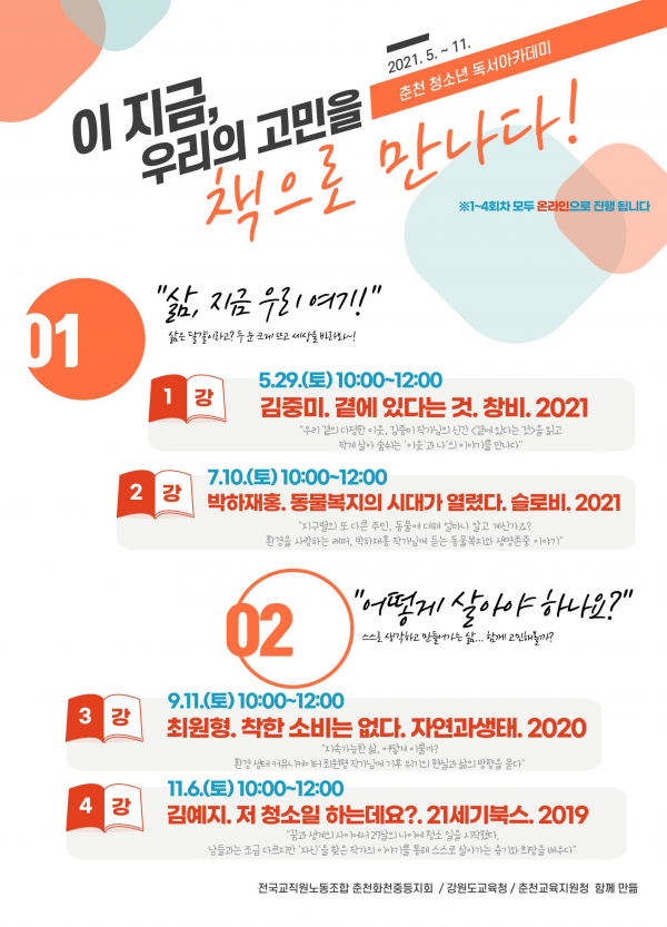 춘천·화천 지역 중고생 독서동아리 연합활동인 ‘청소년독서아카데미’는 1학기, “삶, 지금 우리 여기”, 2학기, “어떻게 살아야 하나요?” 라는 주제로 4회에 걸쳐 온라인으로 진행한다.
