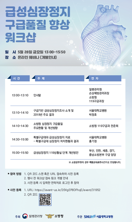 [충청뉴스큐] 질병관리청과 소방청은 5월 28일 오후 1시부터 ‘제1차 급성심장정지 구급품질 향상 워크숍’을 비대면 행사로 개최한다고 밝혔다.