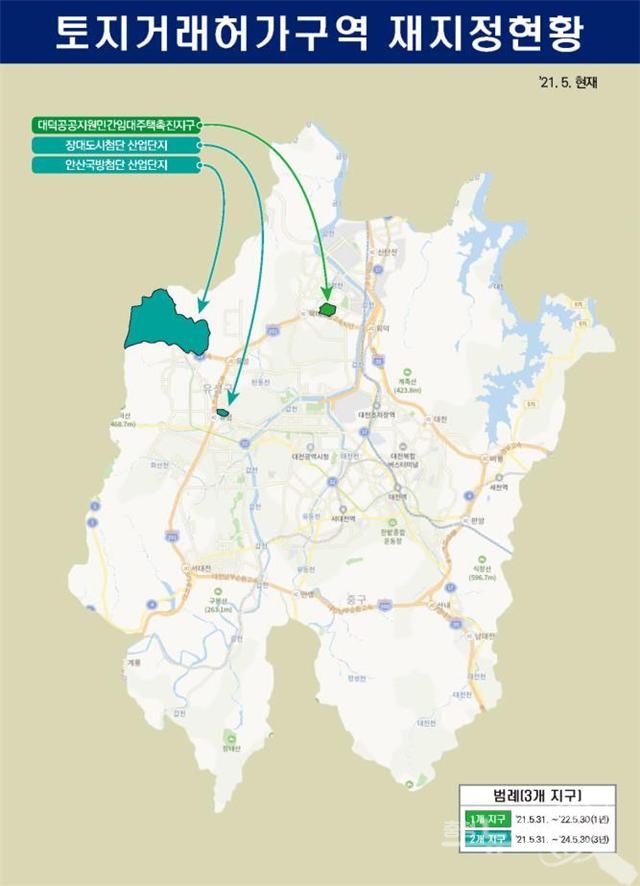 대전시에 따르면, 이번에 재지정된 사업지구 중 ‘안산 첨단국방산업단지’와 ‘장대도시첨단산업단지’에 대해서는 2021년 5월 31일부터 2024년 5월 30일까지 3년간, ‘대전 대덕 공공지원 임대주택 공급 촉진지구’는 2021년 5월 31일부터 2022년 5월 30일까지 1년간 토지거래허가구역으로 재지정했다.