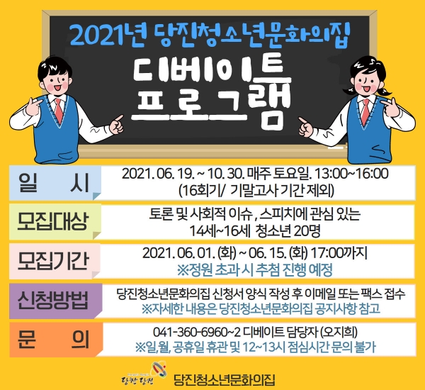 [충청뉴스큐] 당진청소년문화의집에서는 관내 청소년 20명을 대상으로 청소년 디베이트 프로그램을 진행할 예정이다.