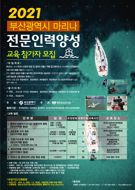 이에 부산시는 마리나 전문인력양성을 위해 연구인력, 교육장비, 전문강사를 갖춘 중소조선연구원을 주관기관으로 선정해 마리나 전문인력 양성사업을 운영하고 있다.