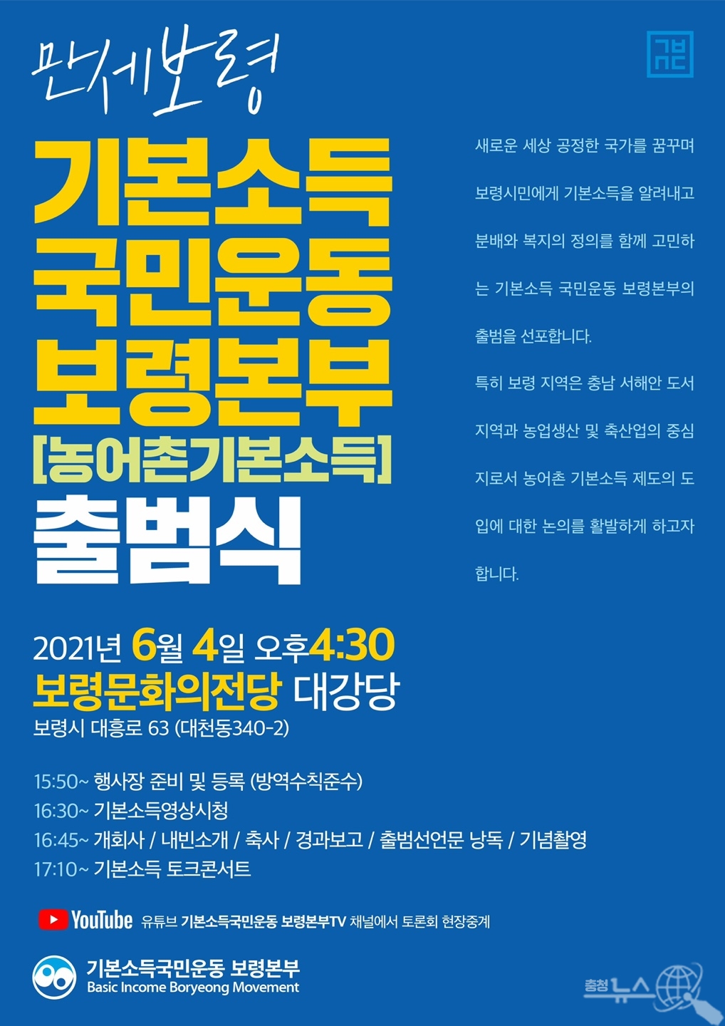 기본소득국민운동 충남본부(상임대표 원기호)는 오는 6월4일 오후 4시30분에 보령문화의전당 대강당에서 기본소득국민운동 보령본부가 출범식을 개최한다“고 밝혔다.