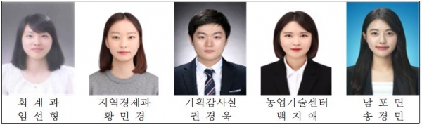 남포면 송경민 주무관은 도서 대출 사업인 ‘행남 북카페’와 농작물 나눔 사업인 ‘남포유 사랑농장’ 운영을 통해 남포면 주민자치를 활성화시켰으며 미소·친절·청결·칭찬 결의대회, 나눔행사 추진 등 미소·친절·청결·칭찬 운동에 앞장선 공로로 5월 중 열심히 일한 공무원으로 선정됐다.