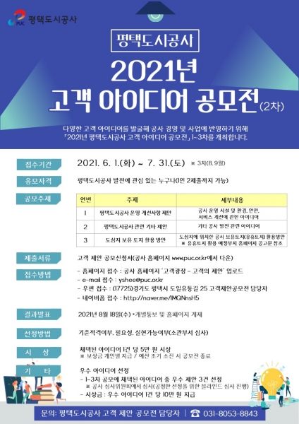 [충청뉴스큐] 평택도시공사는 오는 7월 31일까지 ‘2021년 고객 아이디어 공모전’ 2차 접수를 실시한다고 밝혔다.