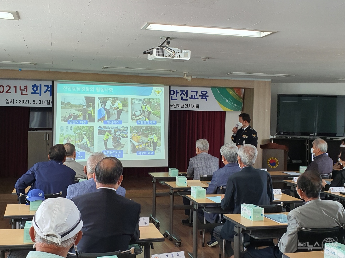 천안동남경찰서(서장 총경 백남익)는, 지난31.신부동에 위치한 천안시 노인회관에서 최근 농번기를 맞아 농기계와 노인 보행자 통행이 증가하여 교통사고를 예방하고자 천안시 노인분회장 30명을 대상으로 찾아가는 교통안전교육을 실시하였다“고 밝혔다.