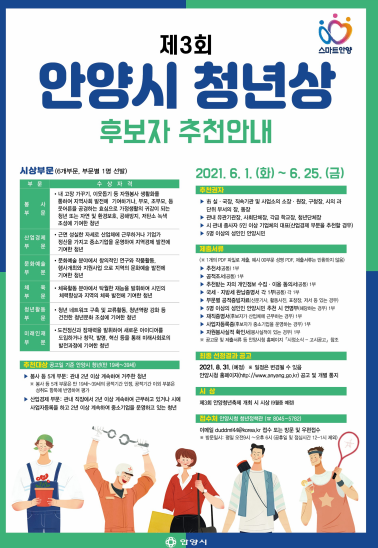 [충청뉴스큐] 청년도시를 표방한 안양시가 이달 25일까지 제3회 안양시 청년상 후보자를 추천받는다.