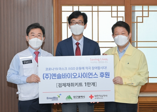 [충청뉴스큐] 대구경북첨단의료복합단지 연구소기업인 ㈜엔솔바이오사이언스는 2일 오전 11시 시청별관에서 권영진 대구시장, 송준기 대한적십자사 대구지사 회장과 관계자들이 참석한 가운데 코로나19 검체채취키트 1만개를 대한적십자사 대구지사에 전달했다.
