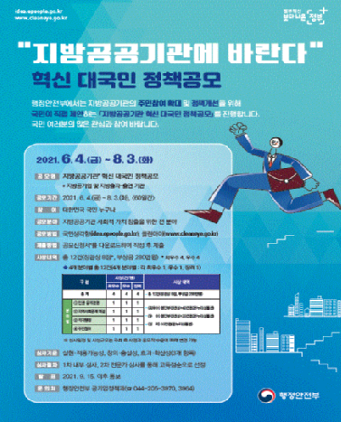 [충청뉴스큐] 행정안전부가 오는 6월 4일부터 8월 3일까지 60일간 ‘지방공공기관에 바란다’대국민 정책 아이디어 공모를 실시한다.
