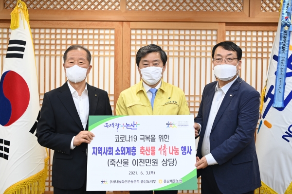 또한, 매월 도내 지역축협 임직원 및 축산관련 종사자들과 일정 금액을 후원하며 소외계층을 대상으로 봉사활동과 기부를 실천하고 있는 나눔축산운동본부 충남도지부와 충남세종농협은 코로나19로 어려움을 겪고 있는 어려운 가정을 위해 2천만원상당의 한우고기 및 목우촌 햄세트 쿠폰 기탁했다.