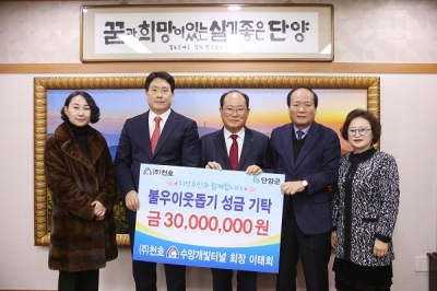 [충청뉴스큐] ㈜천호 수양개빛터널 이태희 회장이 최근 단양군을 방문해 어려운 이웃을 위해 써달라며 성금 3000만원을 기탁했다.