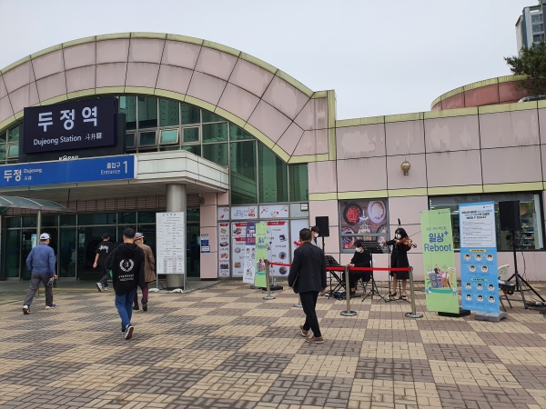 지역 예술인들은 지난 5월 26일과 6월 2일 출·퇴근길 이용객이 많은 두정역과 터미널사거리 인근 교통섬에서 시민들의 바쁜 일상에 음악으로 힐링과 위로를 전했다.