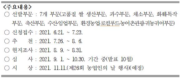 올해 신청·접수는 오는 21일부터 7월 23일까지 읍면동장과 지역농협장, 축협, 과수, 수산업협동조합, 산림조합장에게 신청하고 8월 6일까지 읍면동장과 조합장이 부문별 수상후보자를 평택시장에게 추천하게 된다.