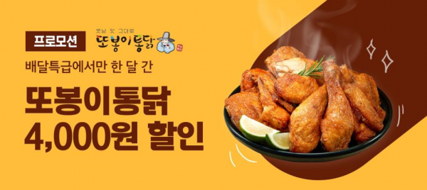 먼저, 또봉이통닭 이용 고객을 대상으로 '4000원 할인쿠폰 지급 이벤트'와 '지역 특산물 100원딜 프로모션'을 진행 중이다.