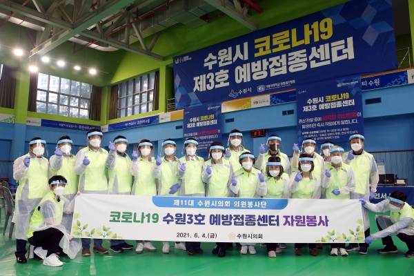 [충청뉴스큐] 수원시의회 의원봉사단은 4일 장안구 국민체육센터에 마련된 수원3호 코로나19 예방접종센터를 찾아 봉사활동을 펼쳤다.