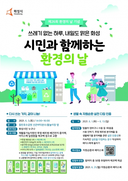 [충청뉴스큐] 화성시는 오는 5일 ‘제26회 환경의 날’을 맞아 시민들과 함께하는 재활용품 교환 및 줍깅 캠페인 등 다채로운 행사를 개최한다고 밝혔다.