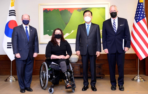 [충청뉴스큐] 정의용 외교부 장관은 6월 4일 금요일 방한 중인 태미 덕워스 의원, 댄 설리반 의원 및 크리스 쿤스 의원 등 미국 상원의원 대표단과 장관 공관에서 차담회를 갖고 한미동맹, 한반도 문제 및 지역·글로벌 사안 등 상호 관심사에 대해 의견을 교환했다.