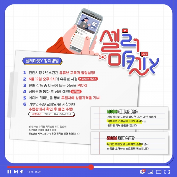 수련관 유튜브 채널을 통해 진행되는 세 번째 대표 청소년어울림마당‘셀러마켓Y’는 온라인 어울림마당의 새로운 패러다임을 열고자 신세대 판매플랫폼인 라이브커머스를 활용한다.