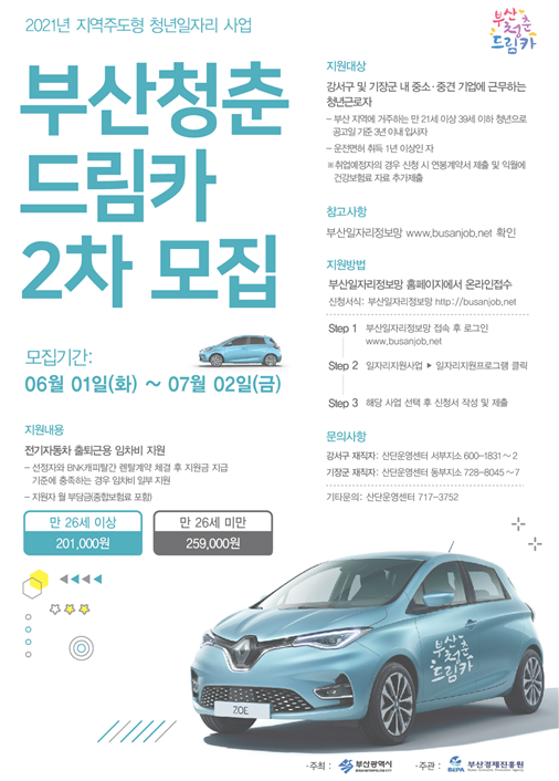 부산시는 대중교통 취약지역인 강서구·기장군 소재 중소·중견기업에 신규 취업한 청년에게 전기차 임차료를 지원하는 ‘2021년 부산청춘드림카 사업’의 2차 참여자 35명을 7월 2일까지 모집한다고 밝혔다.