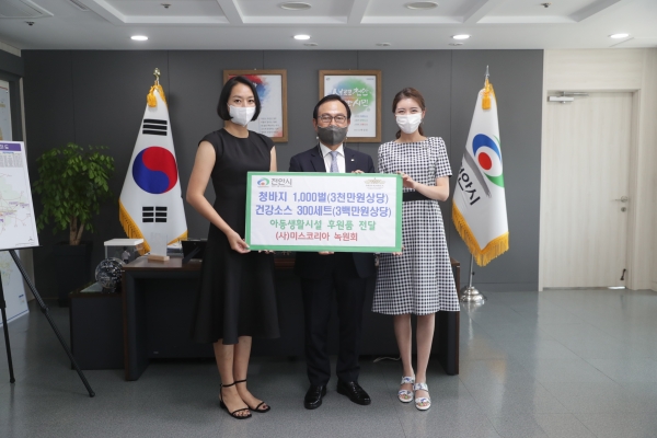 [충청뉴스큐] 천안시는 9일 시청 시장실에서 미스코리아 녹원회 이정민 회장과 유수정 부회장, 윤종환 천안기업인협의회 상임부회장이 참석한 가운데 아동생활시설 후원물품 전달식을 가졌다.