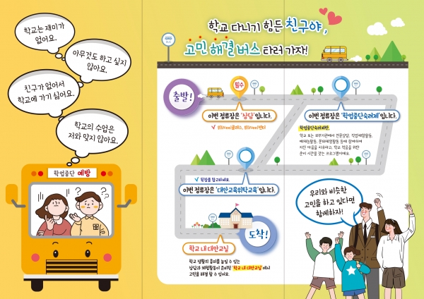 ‘학업중단예방’리플릿에는 학업중단숙려제를 중심으로 대안교육 위탁기관 등의 자료가 안내되어 있으며 학업중단예방 고민해결 버스를 이용한 친근한 이미지로 표현되어 학업중단위기 학생이 다양한 프로그램에 관심을 가질 수 있도록 제작됐다.