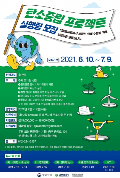 [충청뉴스큐] 대전시는 지역거점별 소통협력공간 조성 사업의 일환으로 탄소중립 실현 및 기후위기 문제를 해결하기 위한 탄소중립 프로젝트를 진행할 실행팀을 공모한다고 11일 밝혔다.