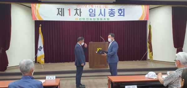 [충청뉴스큐] 대전광역시의회 문성원 의원이 14일 신탄진농업협동조합 본점 3층 대회의실에서 열린 제1차 임시총회에서 민권기 조합장으로부터 감사장을 받았다.