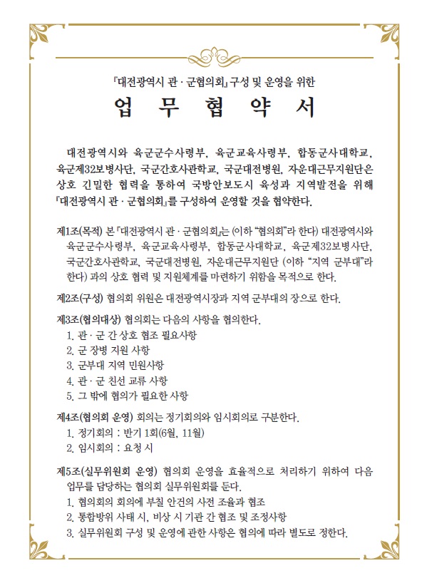 협약내용은 관·군의 상호 협력 및 지원체계를 마련하고, 정기적인 협의회 개최 및 실무위원회를 구성·운영해 군부대 지역민원과 군장병 지원사업 등 관·군 간 상호 지원·협조할 공동의 현안을 폭넓게 논의하는 내용이다.