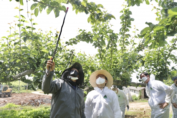 박상돈 시장은 지난 12일 성환읍 성월리 공적방제 현장을 점검하고 과수농가들의 애로사항과 고충을 청취하기도 했다.