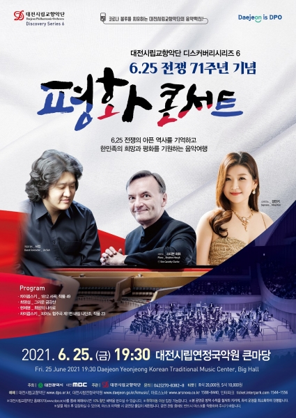 [충청뉴스큐] 대전시립교향악단은 6.25 전쟁 발발 71주년을 맞아 순국선열과 호국영령의 숭고한 희생정신을 기리고 참전용사에 감사의 마음을 전하기 위한 디스커버리시리즈 6 ‘평화 콘서트’를 오는 25일 저녁 7시 30분, 대전시립연정국악원 큰마당에서 개최한다.