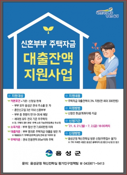 [충청뉴스큐] 음성군은 오는 21일부터 신혼부부의 주거비용 부담을 덜어주고 청년들의 결혼장려를 위한 신혼부부 주택자금 대출잔액 지원사업을 추진한다고 17일 밝혔다.