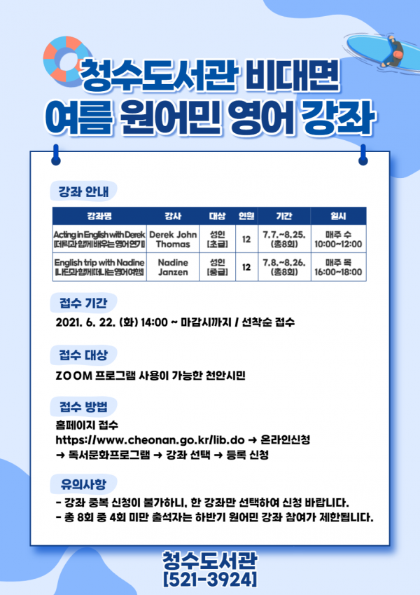 [충청뉴스큐] 충남 유일의 영어특화도서관인 천안 청수도서관이 올 7월부터 8월까지 일반 성인을 대상으로 비대면 여름 원어민 영어 프로그램을 운영한다.