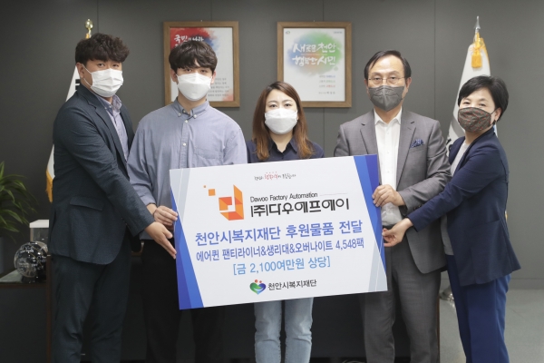 [충청뉴스큐] 주식회사 다우에프에이가 지난 18일 여성청소년 취약계층을 위한 여성 위생용품 4,548팩을 천안시복지재단에 후원했다.