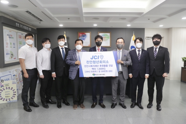 [충청뉴스큐] JCI천안청년회의소가 지난 22일 지역 내 취약계층 지원을 위해 백미 1,000kg을 천안시복지재단에 전달했다.