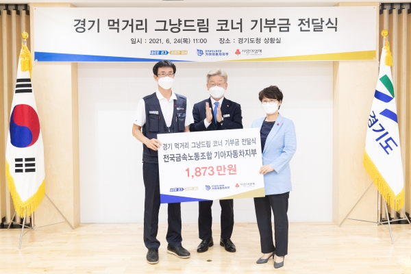 경기도와 전국금속노동조합 기아자동차지부, 경기사회복지공동모금회는 24일 경기도청 상황실에서 ‘경기 먹거리 그냥드림 코너’ 기부금품 전달식을 열었다.