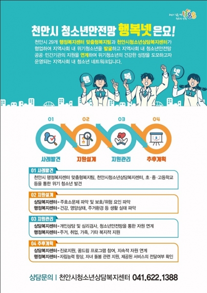올해 3년째 운영되고 있는 동네안전망 행복넷은 관내 30개 읍·면·동 맞춤형복지팀과 천안시청소년상담복지센터의 연계·협력체계이다.