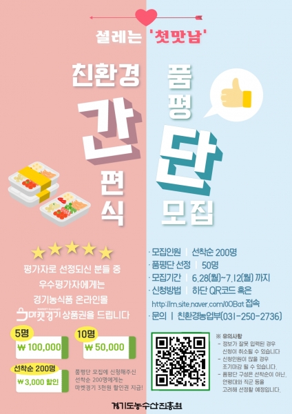 [충청뉴스큐] 경기도농수산진흥원이 9월 말 출시를 앞둔 ‘친환경 간편 도시락’의 시제품 품평단을 7월 12일까지 모집한다.