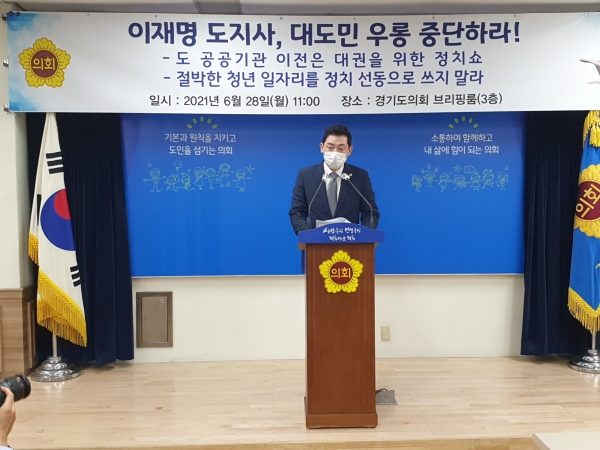 [충청뉴스큐] 경기도의회 양철민 의원은 28일 오전 11시 경기도의회 브리핑룸에서 기자회견을 갖고 “이재명 도지사는 대도민 우롱 중단하라”고 주장하며 “도 공공기관 이전은 대권을 위한 정치쇼”며 “절박한 청년 일자리를 정치 선동으로 쓰지 마라”고 밝혔다.