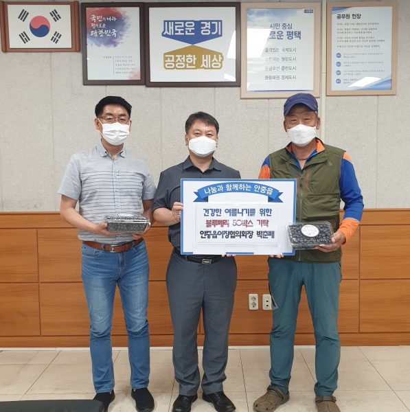 [충청뉴스큐] 평택시 안중읍이장협의회 박춘배 회장이 28일 안중읍행정복지센터를 방문, 어려운 이웃을 위해 직접 재배한 블루베리 50㎏을 전달했다.