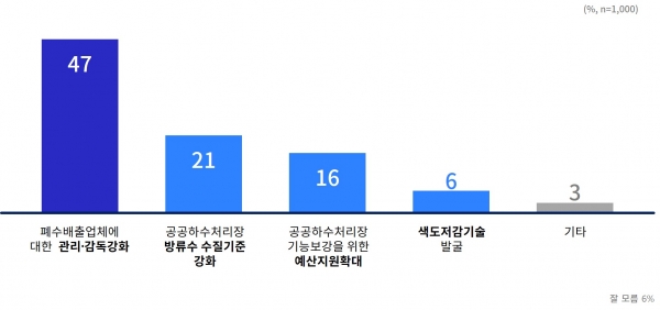 이번 종합대책에서 가장 우선적으로 추진해야 할 부분에 대해서는 ‘폐수배출업체 관리감독강화’가 47%로 가장 많았고 이어 ‘방류수 수질기준 강화’, ‘공공하수처리장 기능 보강 예산 지원 확대’, ‘색도저감기술 발굴’ 순으로 확인됐다.