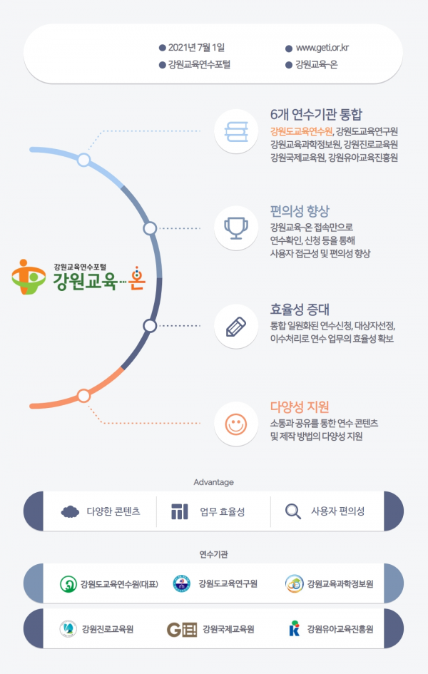 [충청뉴스큐] 강원도교육청은 오는 7월 1일부터 교직원 연수의 접근성 및 편의성 향상, 연수업무 담당자의 효율성 증대, 연수과정의 다양성 확보를 위해 강원교육연수포털 ‘강원교육-온’ 서비스를 연다고 밝혔다.