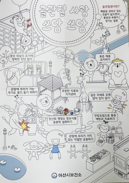 아산시보건소 관계자는 “코로나19 확산으로 건강생활실천이 어려운 독거 어르신들이 건강정보꾸러미를 통해 골관절염과 심뇌혈관합병증 예방수칙을 실천하고 직접 컬러링북을 색칠하시면서 무료함을 달랠 수 있을 것으로 기대한다”고 말했다.