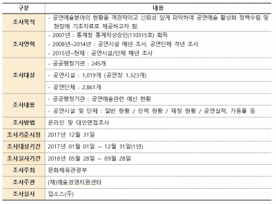 국가승인통계 113015호 ‘2018 공연예술실태조사’는 2018년 5월부터 9월까지 공연시설과 단체·기획사를 대상으로 온라인 및 대인면접조사를 통해 실시됐다. 표본오차는 95% 신뢰수준에서 공연시설 ±2.8%포인트, 공연단체 ±2.7%포인트이다.
