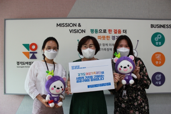 정정옥 경기도여성가족재단 대표이사는 이날 재단 사회관계망서비스에 ‘경기도여성가족재단이 사회적 가치를 구매하는 공공구매를 응원한다’라는 메시지를 게재하며 사회적경제기업 제품·용역에 대한 공공 구매 확대 의지를 피력했다.