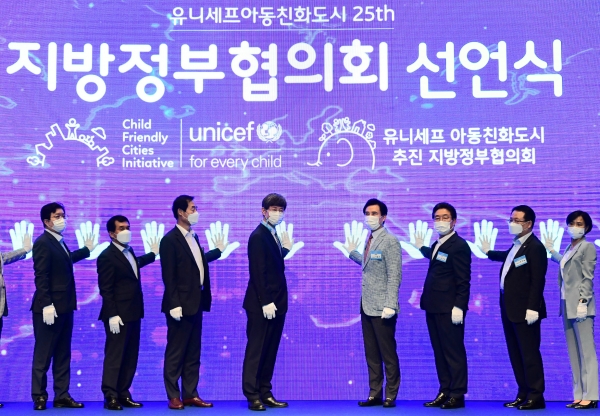 이어진 선언식에서는 유니세프 본부 헨리에타 포어 사무총재의 축사영상을 시작으로 앞으로 아동친화도시가 가야할 방향을 돌아보고 지방정부협의회 단체장들의 선언 세레머니로 마무리됐다.