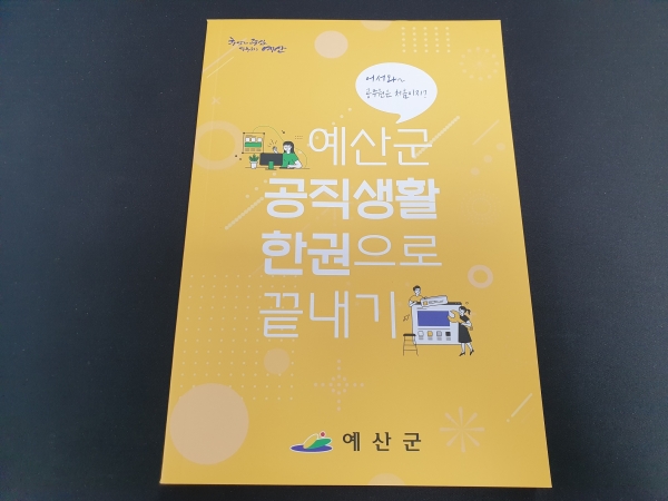 [충청뉴스큐] 예산군은 신규 공무원들이 공직생활에 쉽게 적응할 수 있도록 근무를 하면서 필요한 내용을 수록한 ‘예산군 공직생활 한권으로 끝내기’를 제작해 신규 공무원에게 배부했다.