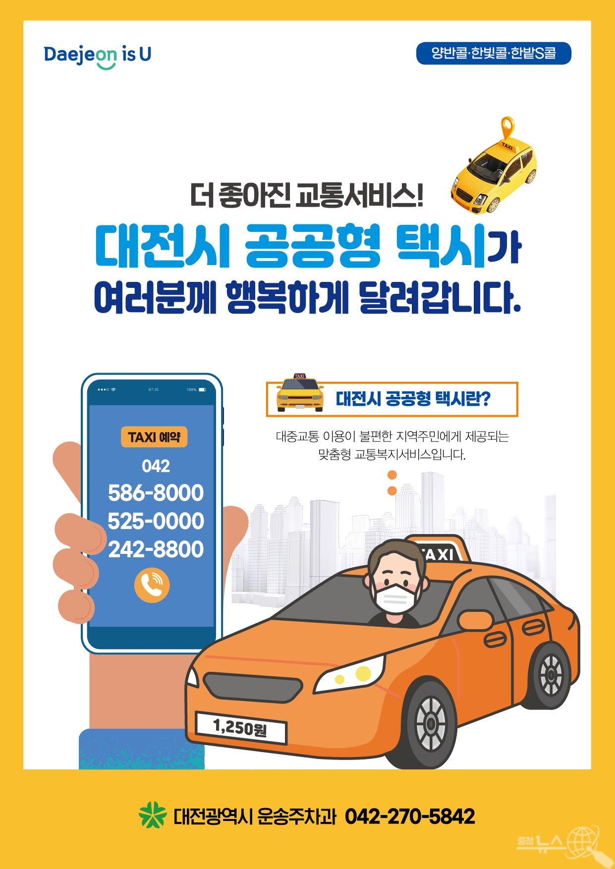 대전시가 광역자치단체에서는 처음으로 대중교통 이용이 불편한 지역에 거주하는 시민의 편의를 위해, 오는12일부터 이용자의 요구에 따라 부정기적으로 운행하는 수요응답형 교통수단인 ‘공공형 택시’를 시범 운영한다“고 밝혔다.